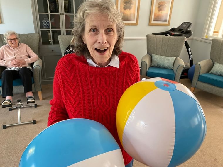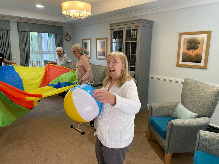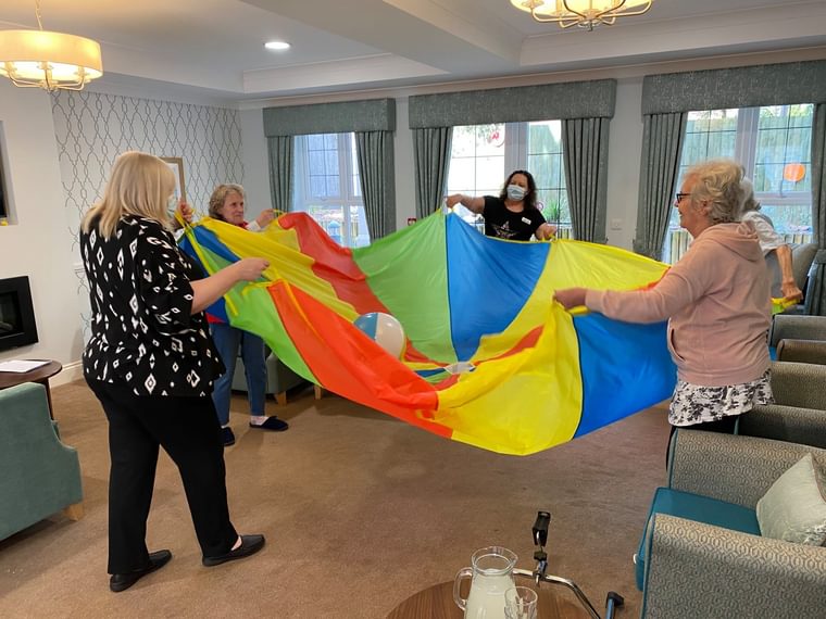 Parachute games help to develop and create trust between our residents, whilst practising movement and coordination. With the game waves residents hold the parachute tightly, and move their arms up and down to make small and large waves. At Parris Lawn the health and wellbeing coordinators have added a ball, residents use their arms to move the ball from side to side across the parachute, trying to stop it dropping to the floor and keep the movement going.