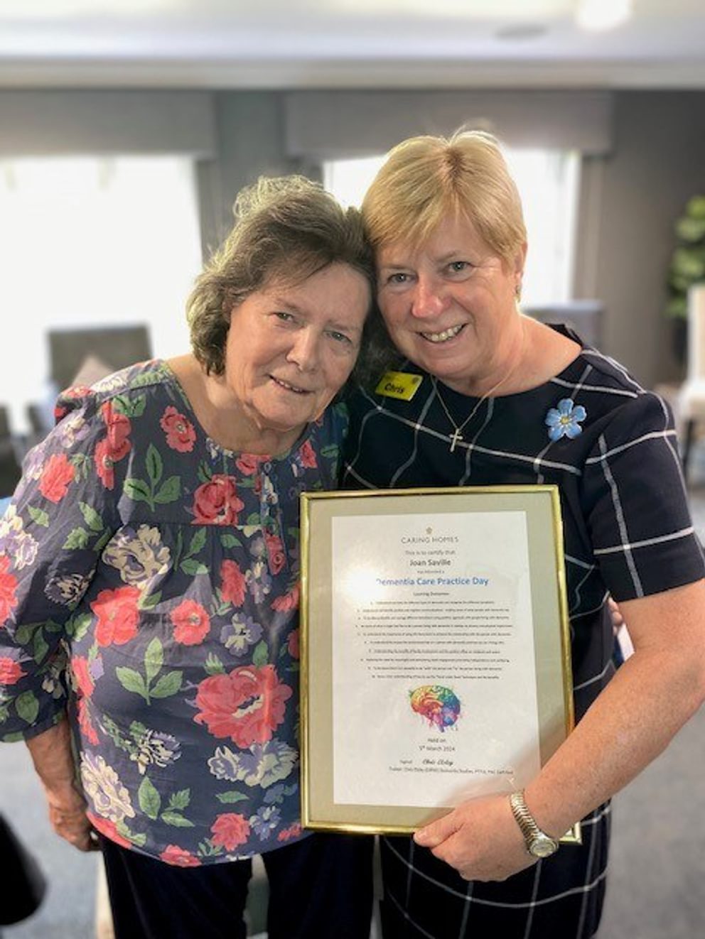 Chris ordered a certificate for Joan to mark her course attendance and presented it to her in a frame at the final staff training session – a very proud moment for both Joan and Chris.