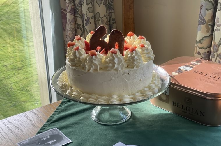 Their 60th anniversary morning (or 15 leap years!) was bright and sunny – the perfect start to a special day, as the Castle View team began decorating the dining room with balloons, mounting a spectacular cake onto its stand, and adorning Peter and Marylyn’s doors with an anniversary sash alongside a photo of their wedding day.