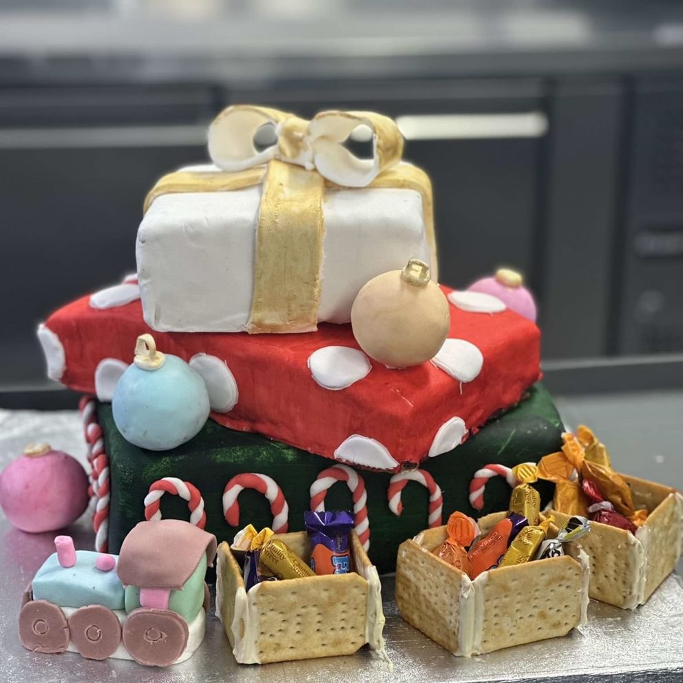 - Castle View: a traditional Christmas cake made in the shape of presents, baubles and a train
