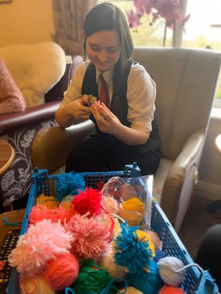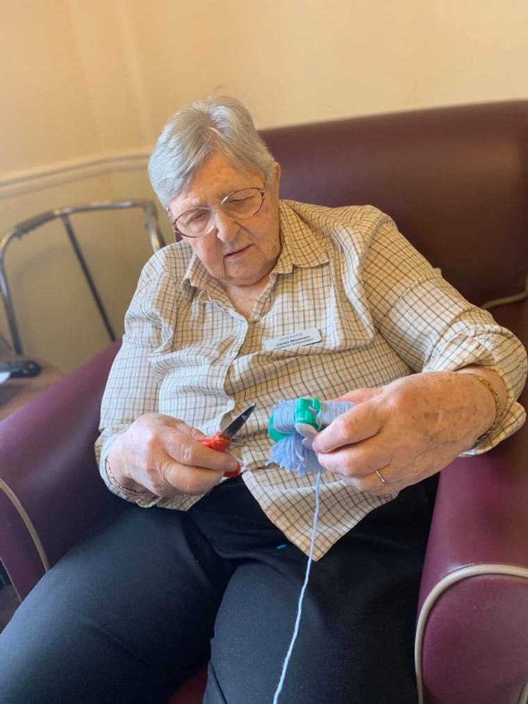 “All our residents were involved, either working independently or helped by a member of the care team,” said Vicky. “There was a lot of reminiscing as a lot of people could remember making pompoms when they were younger and using all sorts of things to wrap the wool around – now it is a pompom maker gadget which you can buy online.”