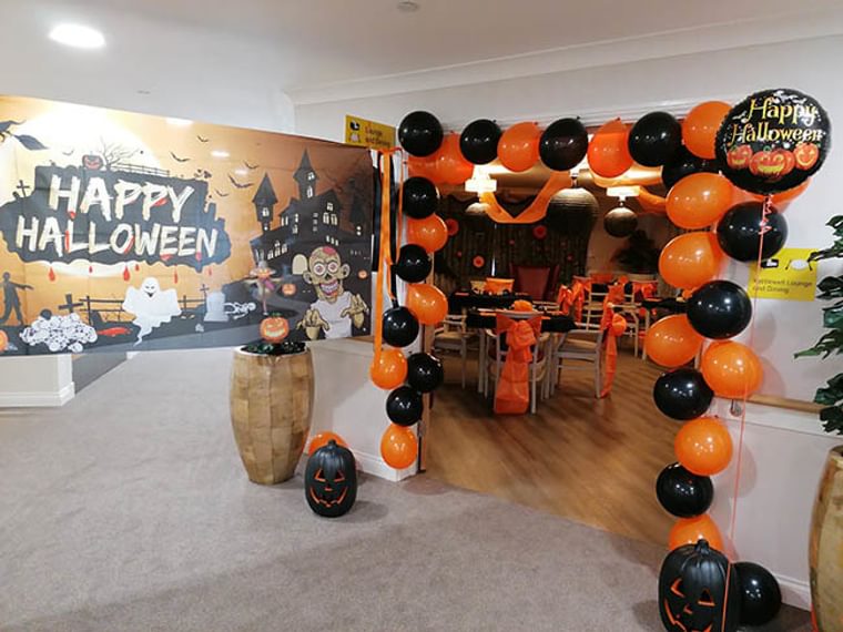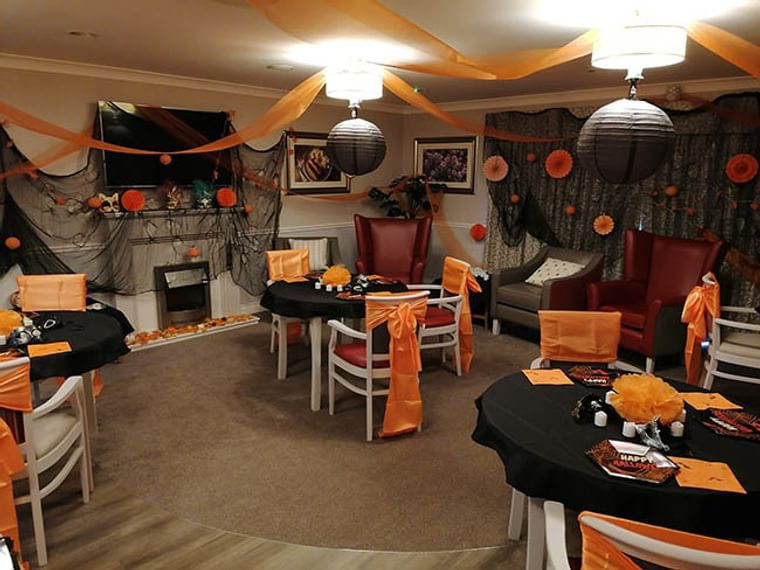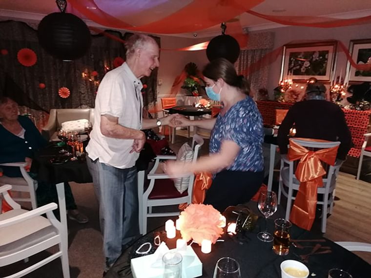 The Wellbeing Co-ordinator Claudia at Horsell Lodge Care Home didn't miss a trick when treating the residents to a Halloween masquerade dinner and dance. The orange and black theme was dominant and in keeping with Halloween tradition, with the chandeliers and venetian masks adding a special touch. The residents and team got dressed up for the occasion in party attire, not forgetting the masks of course and the food presented by the hospitality team was devilishly tempting.