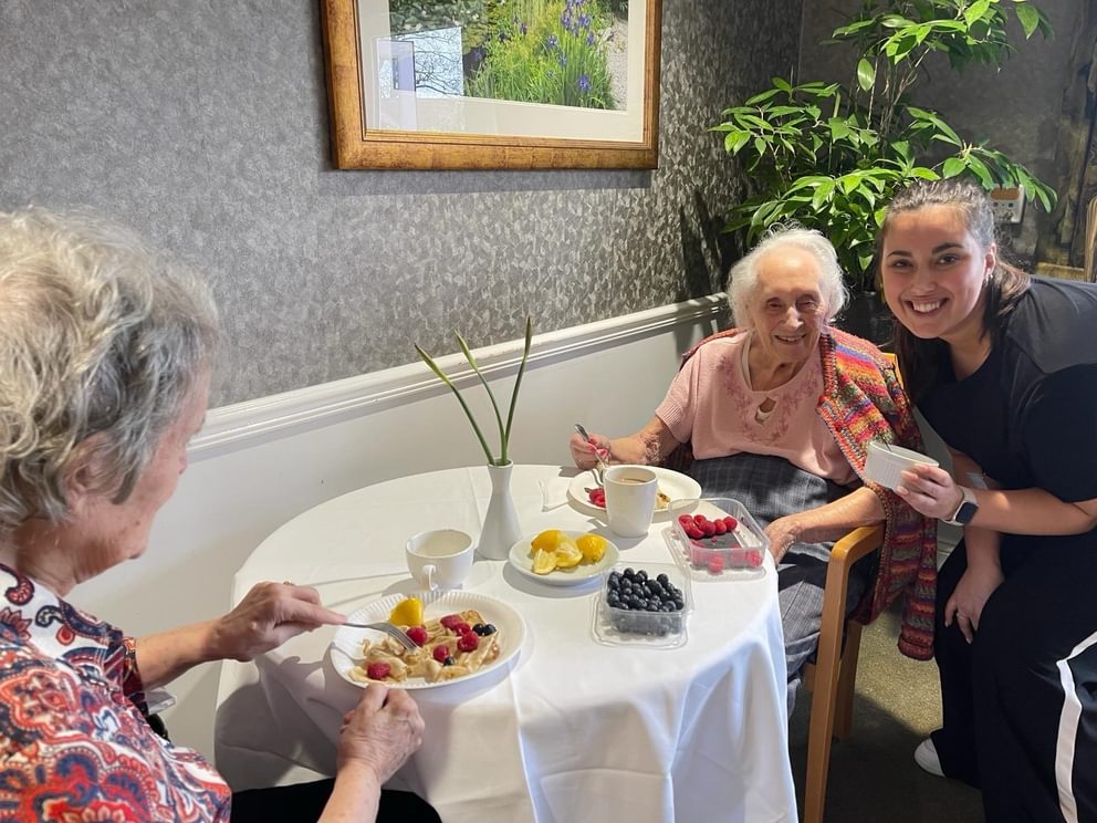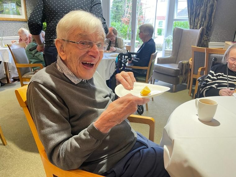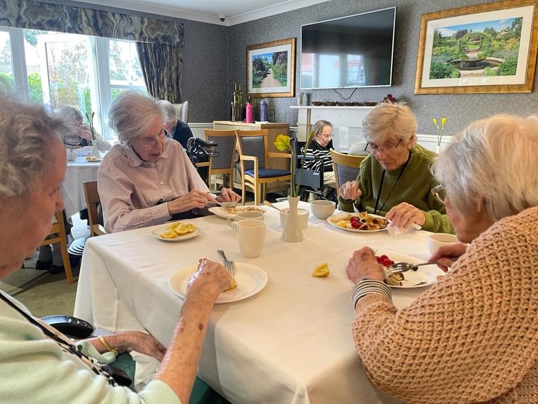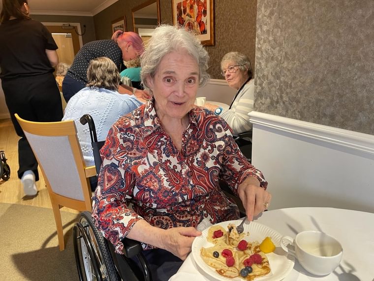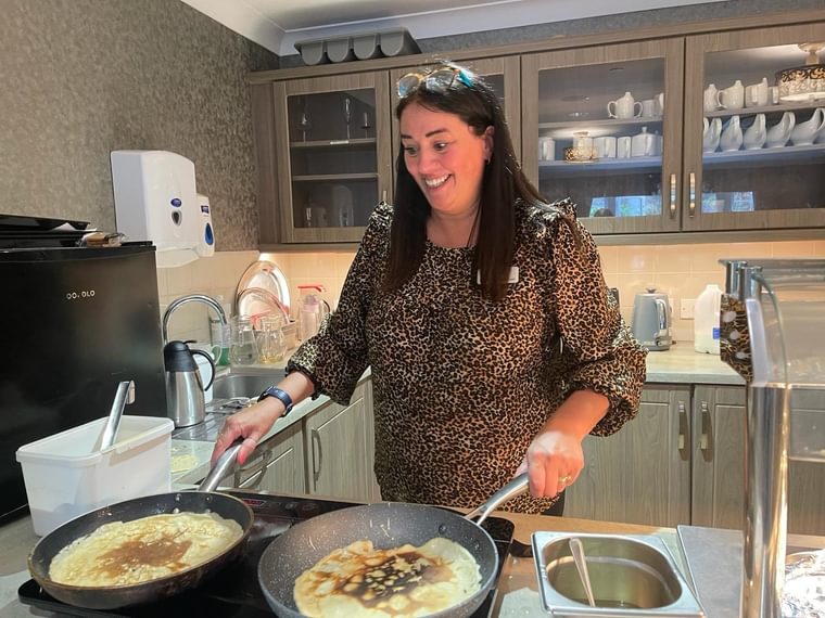 When pancake hour arrived, team members and residents split their time between making their own pancakes, seeing who could do the highest flip and finally, enjoying the decadence of eating them! Eileen was happy with the end result, especially as her daughter and son in law got into the spirit of the day. She explained: “They had pancakes too and helped serve, they really enjoy coming here mixing with all the nice people and eating nice treats.’’