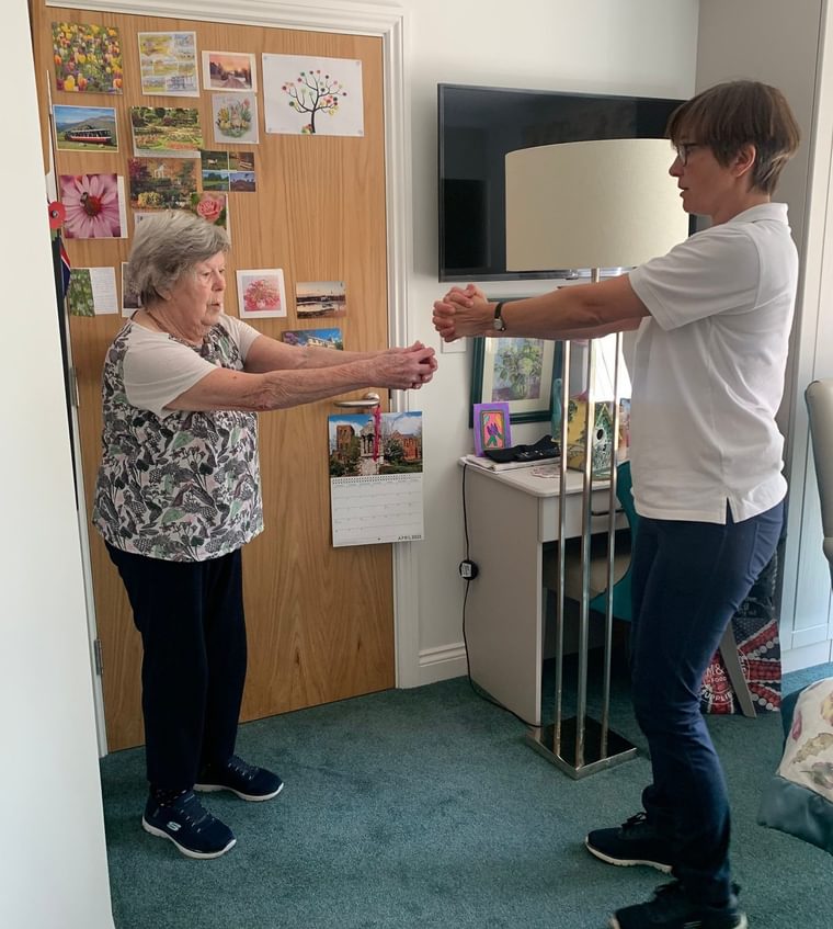 Benson House Home Manager, Cathy, is also able to use Helen’s time in a number of ways, including holding weekly group activities for residents covering subjects like improving balance, staff training on areas such as therapeutic handling, and evaluations or falls risk assessments for individuals. As part of this, Helen was recently asked to carry out a physiotherapy assessment with resident Rosemary who had been identified as being at potential risk of falls.