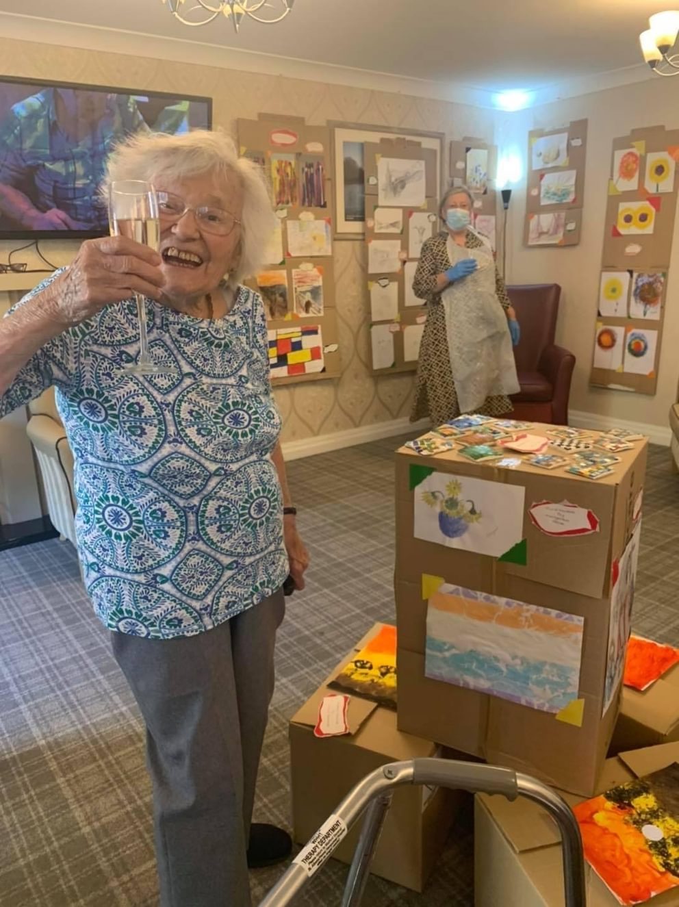 Residents and relatives enjoyed the spread and glass of bubbly, and there was lots of positive feedback from the relatives that came to see, and the residents were also really chuffed to see their art work displayed.