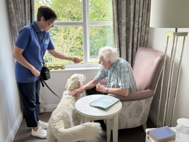 The morning began with a visit from one of the care home’s most popular guests, much-loved therapy dog, Nell. Nell is a fluffy golden retriever who’s been a Benson House regular for a couple of years, along with her owner and volunteer, Julie. The pair joined residents in the communal areas where Nell was showered with treats, cuddles, and lots of affection and as always, they made time to visit residents unable to leave their rooms. Nell’s gentle nature and wagging tail never fail to lift everyone’s spirits, including resident Iris, who had previously owned a golden retriever and a black labrador. When Iris first saw Nell she said, “She's so beautiful, just like my old babies”, and showed the team some pictures of her own dogs.