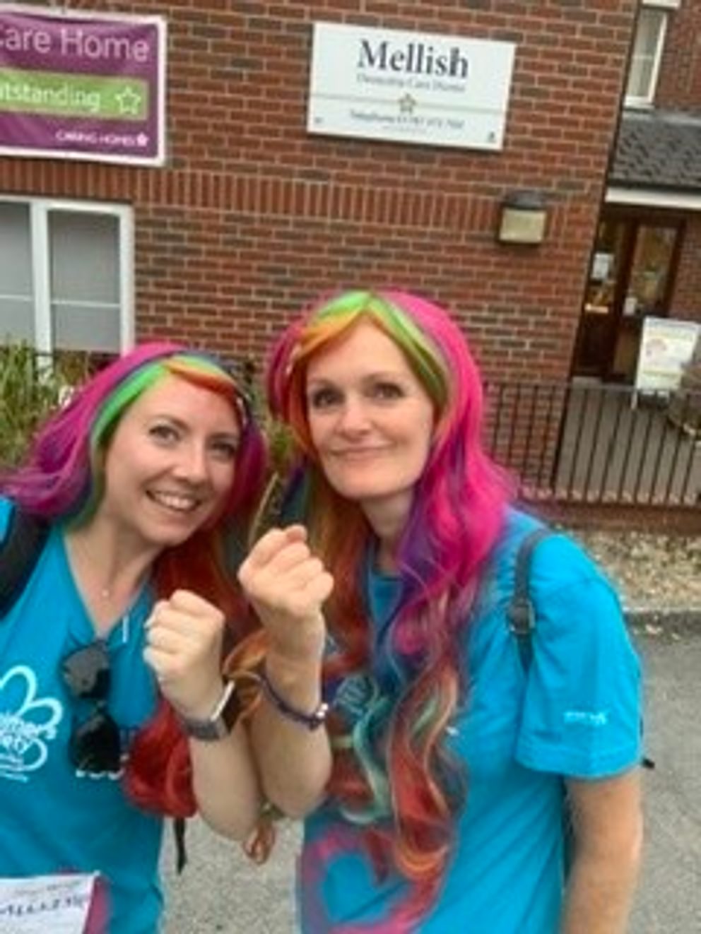 Claire and Chloe walked 21 miles from from Mellish House Care Home in Sudbury, to Melford then to Lavenham and back again dressed in their charity t-shirts and colourful wigs to raise money for this charity which is obviously so close to their hearts. They walked in honour of all our residents at Mellish House.