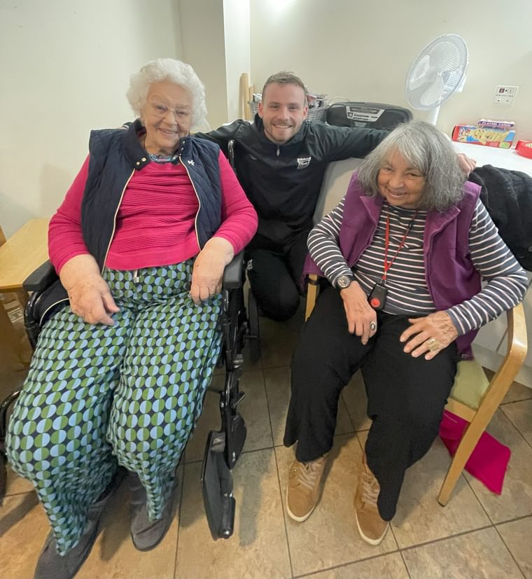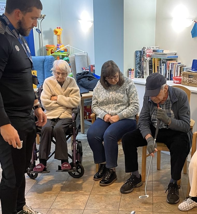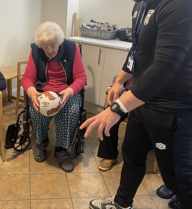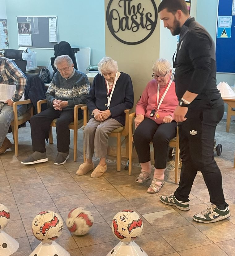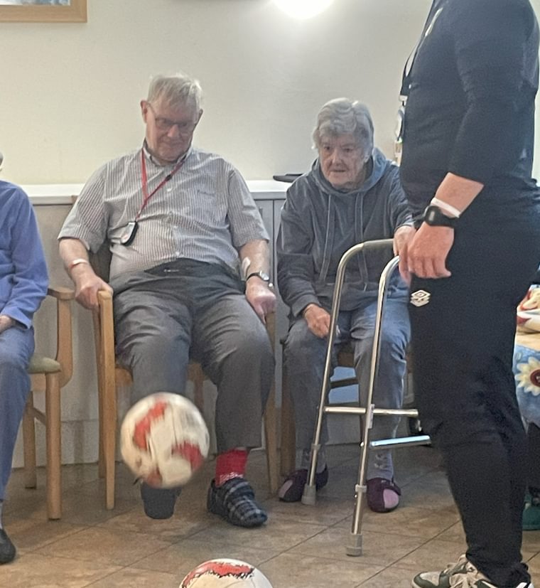 The event included a mix of light exercise routines, fun challenges, and mini football games, with Sam and Callum guiding participants through each activity. There were plenty of smiles and lots of laughter as residents showed off their skills, whether it was throwing soft footballs or taking part in a friendly team competition.