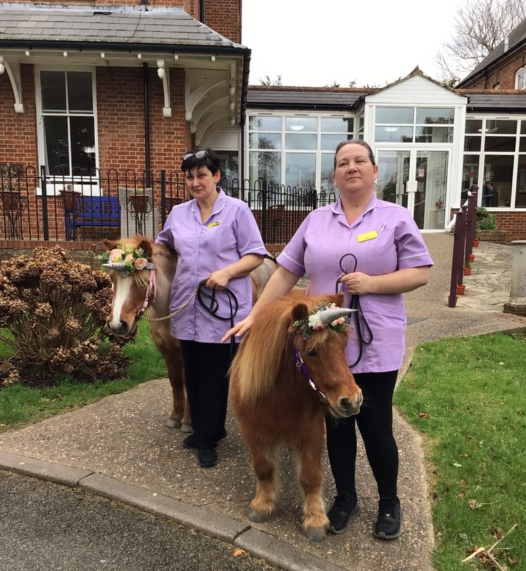 At 10am two ‘unicorns’ arrived as a surprise for Doris, bringing a lovely birthday card and a pink rosette for her to wear. Doris was very touched by this gesture and proudly wore her rosette for the rest of the day. She really enjoyed stroking and patting the ponies and said she was feeling like a little girl again. “I’m having a wonderful day”, remarked Doris, as the ponies departed and she was joined by family members. Birthday lunch was served and included all of Doris’s favourite things – a celebratory glass of prosecco, baked salmon served with vegetables, and strawberry gateaux to finish.