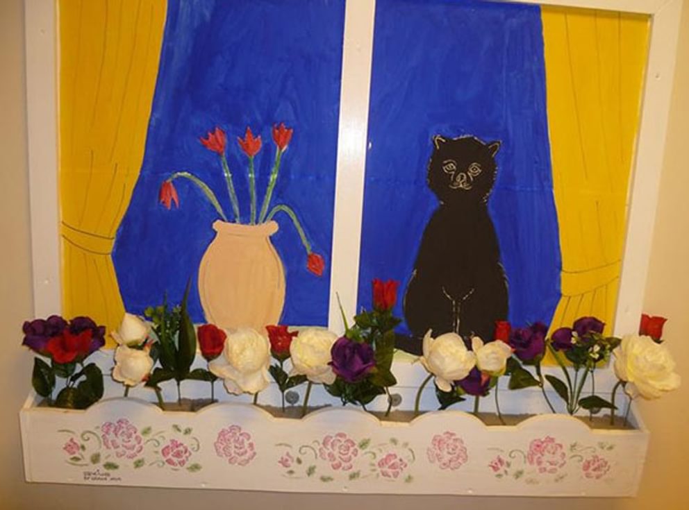 A couple of the residents, along with Glenda the home’s Activity Coordinator and Ron the SMO (Site Maintenance Operative), worked together to get the project completed. Ron made the frame and window box, while Glenda painted the scene featuring a cat and vase of tulips. Followed by some stenciling by Grace and Josephine putting the final touches to it by arranging the silk flowers.