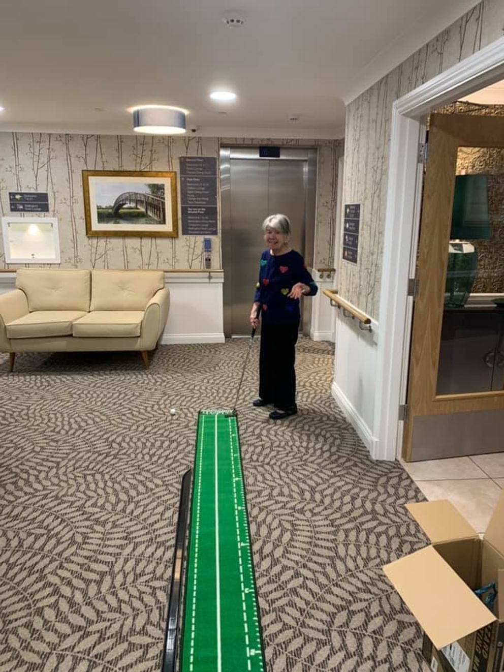Mini Golf has taken over at Benson House Care Home and the residents and team are enjoying getting into the swing of it. There may be a big golf tournament on at the moment but nothing can compare to the fun that everyone is having with this new activity at the home. Providing gentle exercise and remaining active, while in some cases getting a bit competitive to sink that putt!
