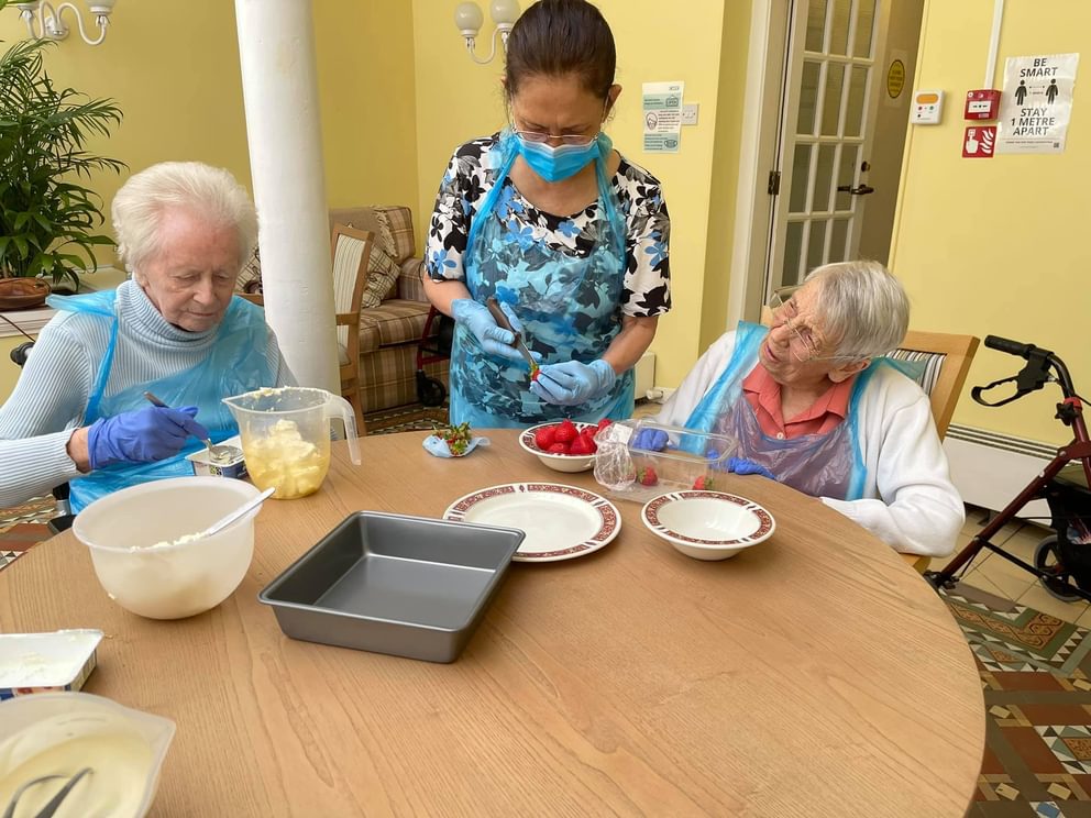 Today residents and the care team created a Non-baked Eton Mess Cheesecake! You can see their enjoyment crushing the biscuit, mixing the cheesecake mix and topping off with strawberries. The end result was a delicious dessert to have with a cup of tea or coffee, thoroughly enjoyed by all and sealing the accomplishment of our ladies!