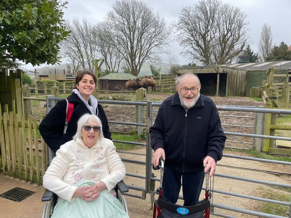 When it was discovered that both Pat and Albert were keen to pay a visit to the zoo, the wheels were put in motion for a trip to Drusillas Park, a small zoo just 20 minutes away by car. Pat wished for the zoo trip because loves the days when Pet Pals Therapy bring animals to meet residents at Parris Lawn. These animals are domesticated and strokable – for example, rabbits, kittens and guinea pigs – so a trip to the zoo was a step up and Pat was keen to be out in the fresh air seeing more exotic animals living their lives.