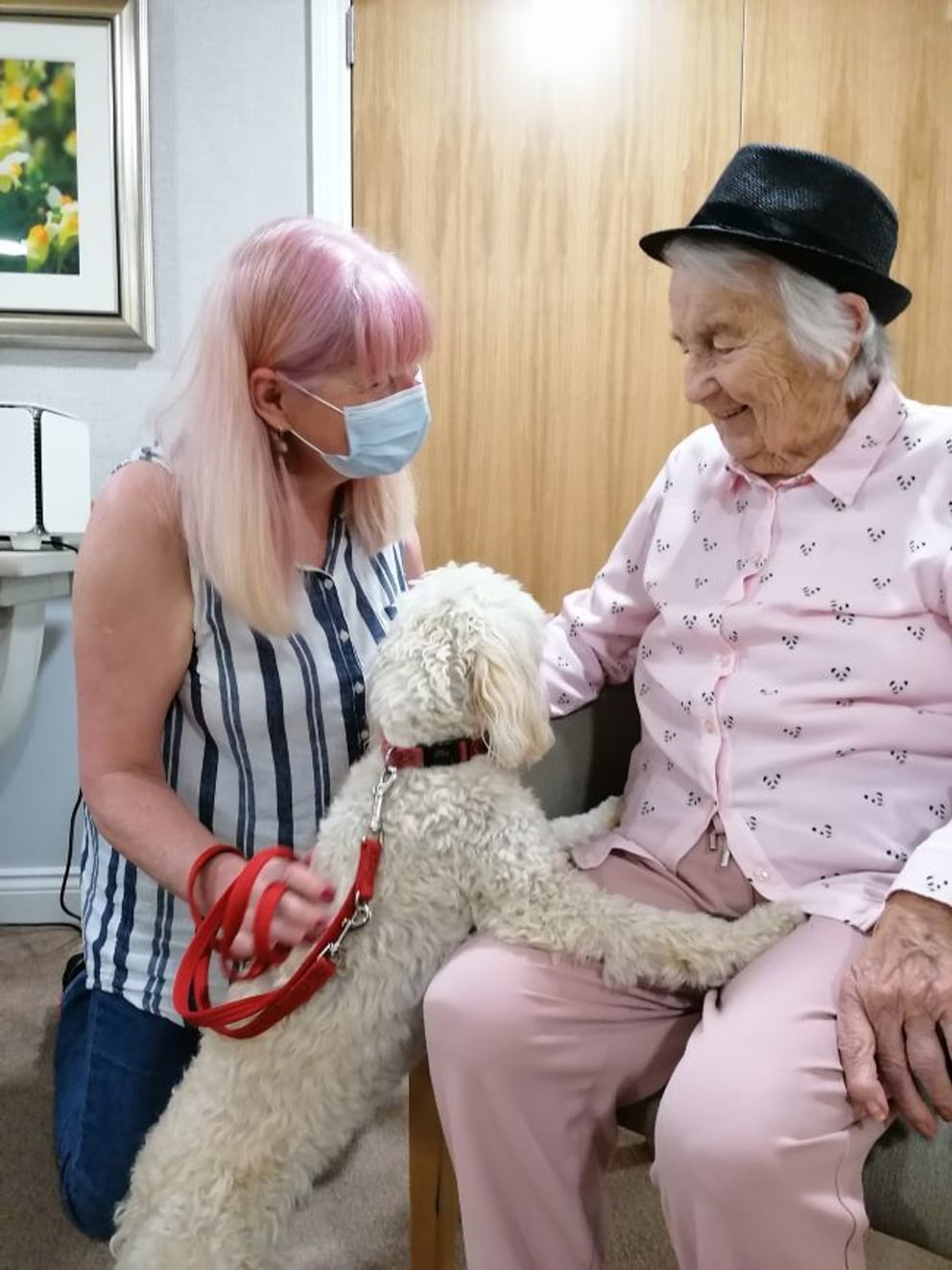 The residents at Horsell Lodge Care Home had a visit from Bella and they all loved meeting her. Pet therapy has been shown to improve satisfaction, energy levels, self-esteem, and mood, as well as decrease depression. Additional benefits include increased motor skills and movement, improved social skills and verbal communication.