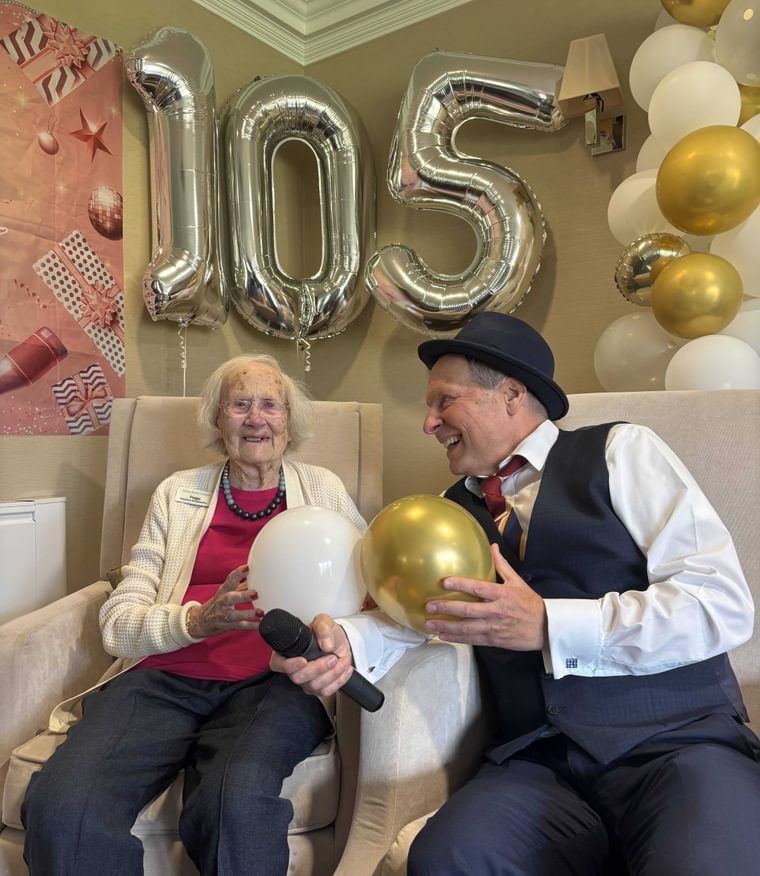 Peggy celebrated her 105th birthday in style on May 8th, 2025 – a very different occasion to her 25th birthday which coincided with Victory in Europe Day. It’s safe to say that most birthdays would have taken a back seat on the day that the end of World War 2 was declared. This time around, Peggy was the centre of attention at Homefield Grange Care Home in Christchurch.