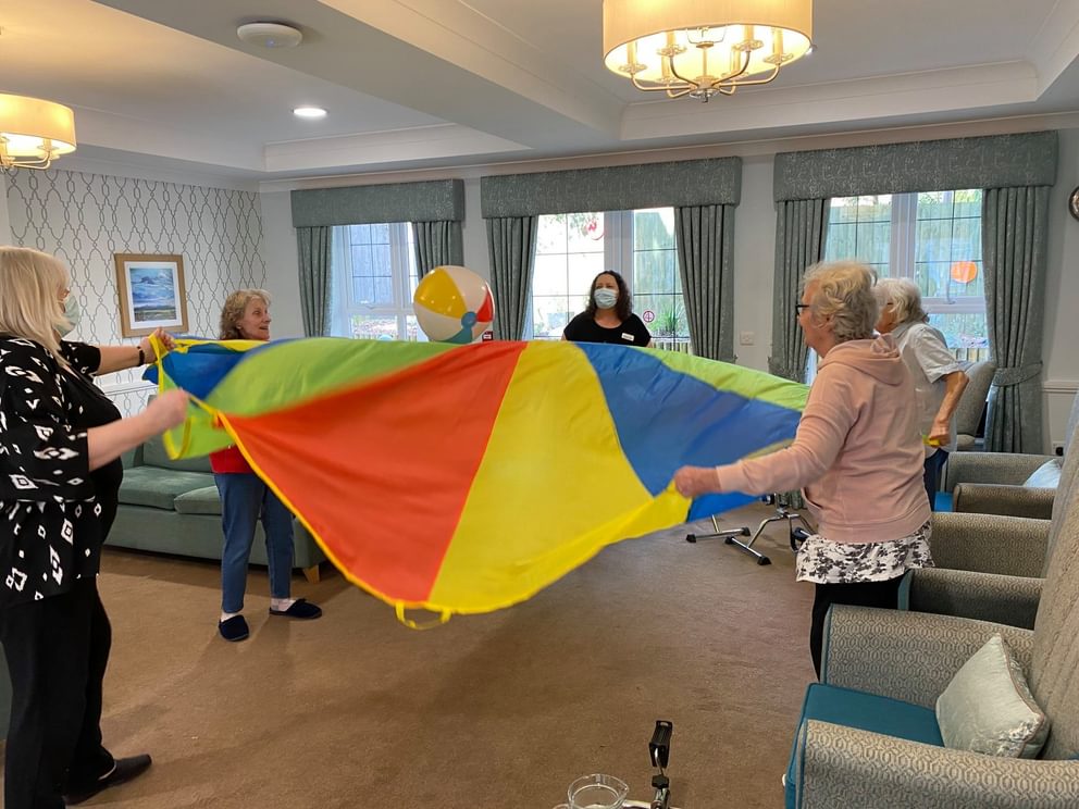 Parachute games help to develop and create trust between our residents, whilst practising movement and coordination. With the game waves residents hold the parachute tightly, and move their arms up and down to make small and large waves. At Parris Lawn the health and wellbeing coordinators have added a ball, residents use their arms to move the ball from side to side across the parachute, trying to stop it dropping to the floor and keep the movement going.
