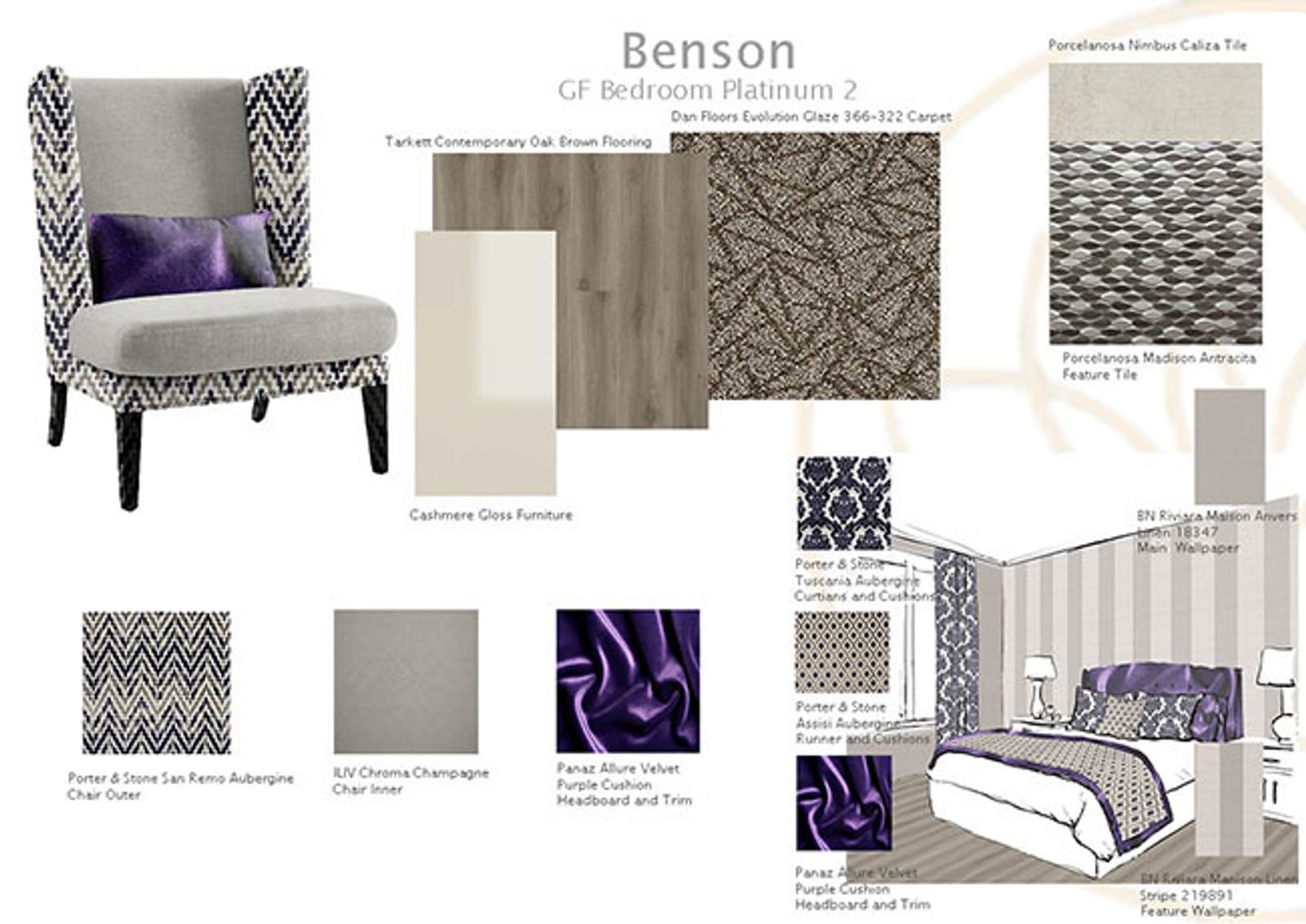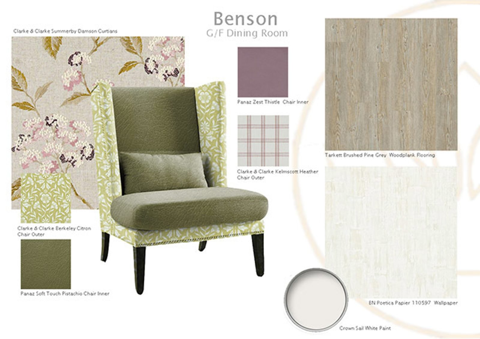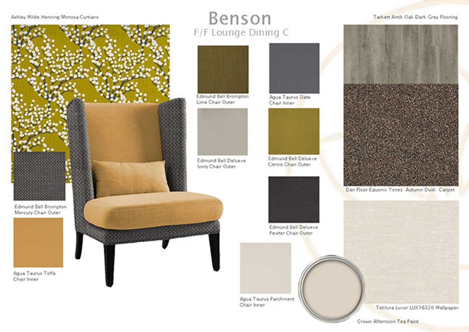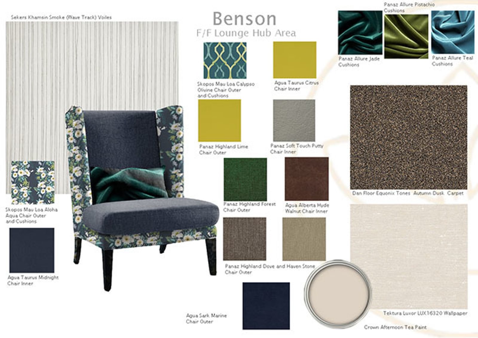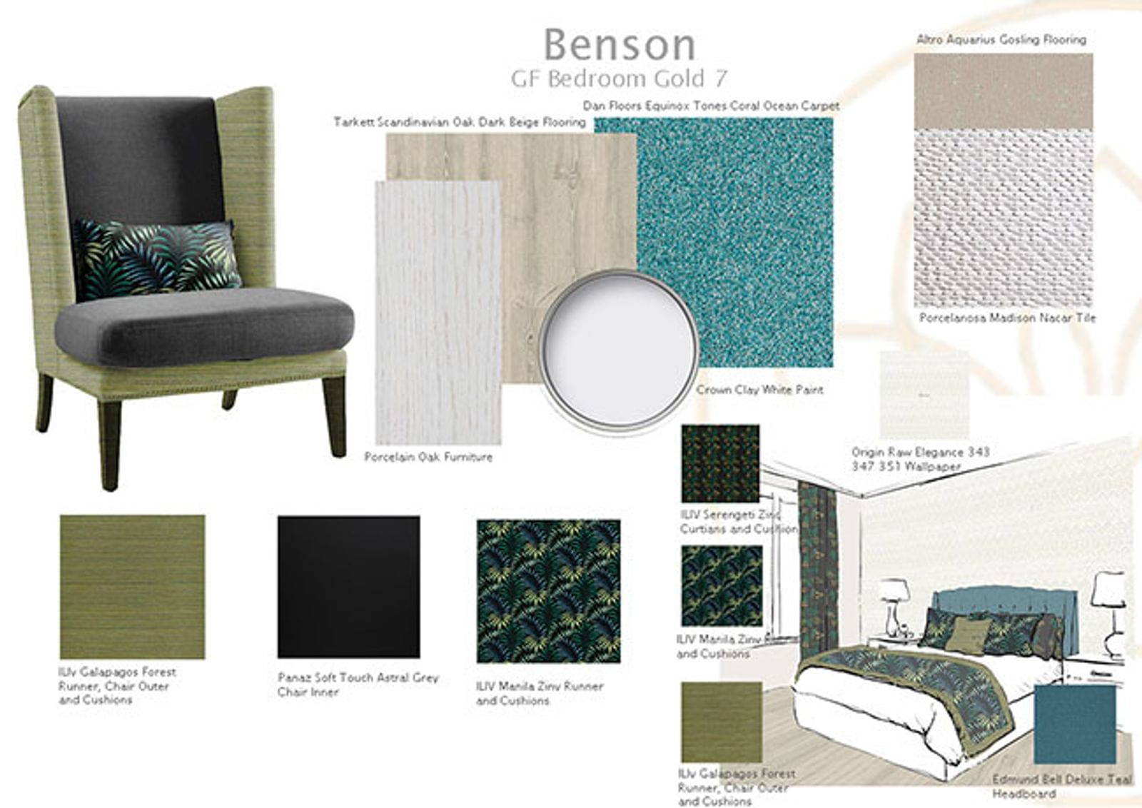 There’s luxury Tarkett brushed pine grey flooring in the Benson Dining Room and aqua tones in the Lounge. Beautiful floral patterns in some of the bedrooms are echoed in the runners and cushions. If you take a look at the mood boards (below) put together by our interior design team, with their experience in optimum design for older people, you can get a real feel for the quality and contrasts you will find throughout the rooms at Benson House.